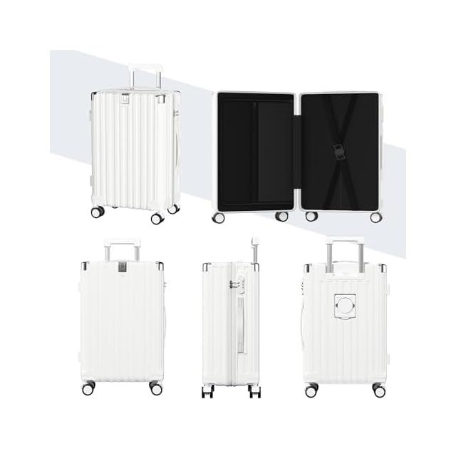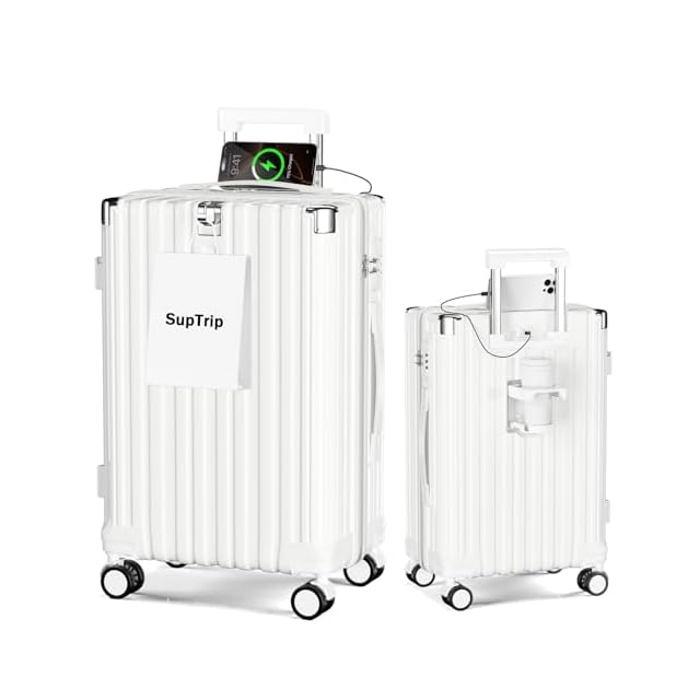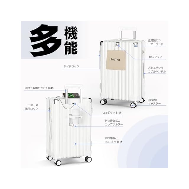 [SupTrip] スーツケース 機内持ち込み 多機能 キャリーケース 大型 超軽量 キャリーバッグ 耐衝撃 USBポート付き カップホルダー付き 充電機能 荷物フック 隠しフック機能 静音 ダブルキャスター 360度回転 修学 泊まる 旅行 出張 (ホワイト, XL (78L/7-10泊))