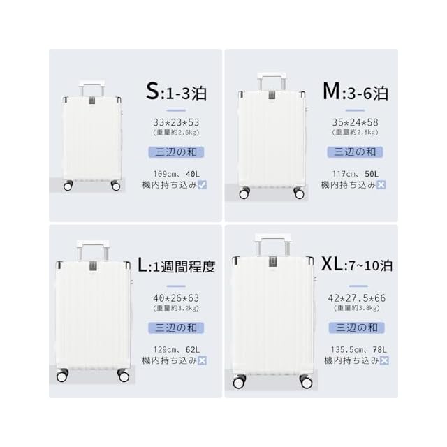 【サイズ】Sサイズ(機内持ち込みOK): 33×23×53cm(重量約2.6kg)、容量約40L(1~3泊対応);Mサイズ:35×24×58cm(重量約2.8kg)、容量約50L(3~6泊対応);Lサイズ:40×26×63cm(重量約3.2kg)、容量約62L(1週間程度);XLサイズ:42×27.5×66cm(重量約3.8kg)、容量約78L(7~10泊対応)※サイズ測定には多少の誤差がありご了承ください。