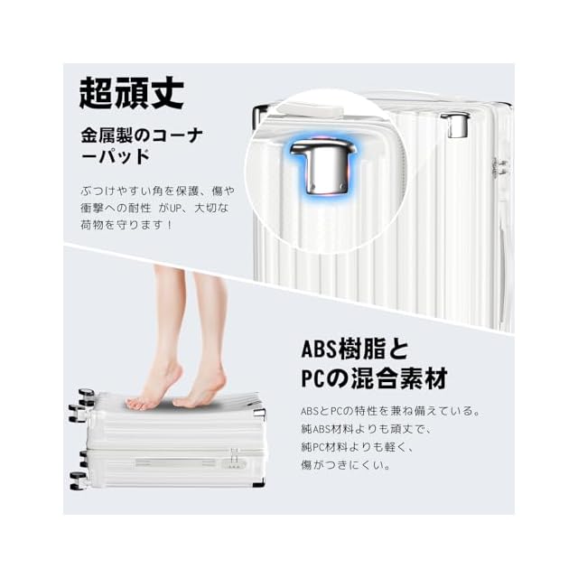 【軽量で頑丈なABS+PCボディ】 本体は軽量性と耐衝撃性に優れたABS樹脂とPCの複合素材を採用。女性でも楽に持ち上げられる重さです。表面に施された無数の微細な凹凸模様が傷つきを防止し、さらに四隅にアルミニウム合金製メタルガードを4ヶ所配置。耐衝撃性能を向上させることで、スーツケースの耐久性をさらに高めています。