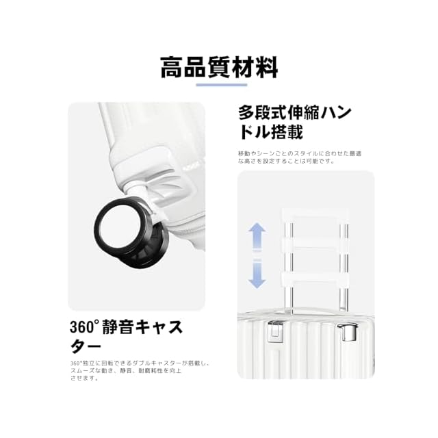 【360°静音キャスター・快適な弾性ハンドル】360°独立に回転できるダブルキャスターが搭載し、スムーズな動き、静音、耐磨耗性を向上させます。また、スーツケースにはシリコンソフトハンドルが2つ付属しています,人間工学に基づいた設計、柔らかくて握りやさしい、長時間持っても疲れにくい。