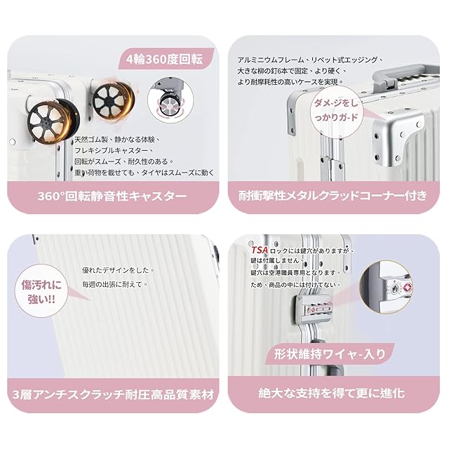 【素材】1,表面素材には三層構造のPCポリカーボネート樹脂+ABS素材を採用しており、軽量なのに耐衝撃性に優れています。長期間使用しても傷が目立ちにくいです。人気のアルミフレームを採用しており、ビジネスでもカジュアルでもシーンを選ばずに使用できます。スタイリッシュでありながら、と国内旅行や出張には十分な大きさです。 2,フレーム:アルミ。軽量で持ち運びやすいです。女性でも男性でも持てるカラーとデザイン。