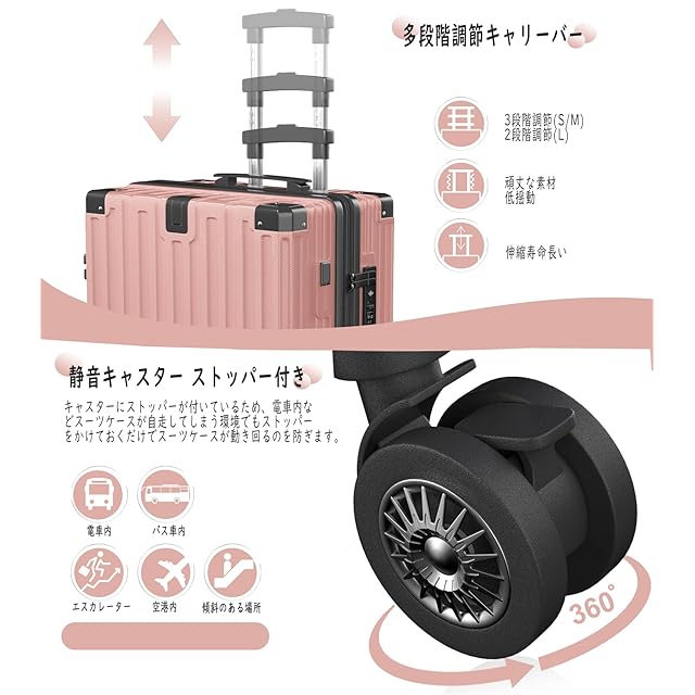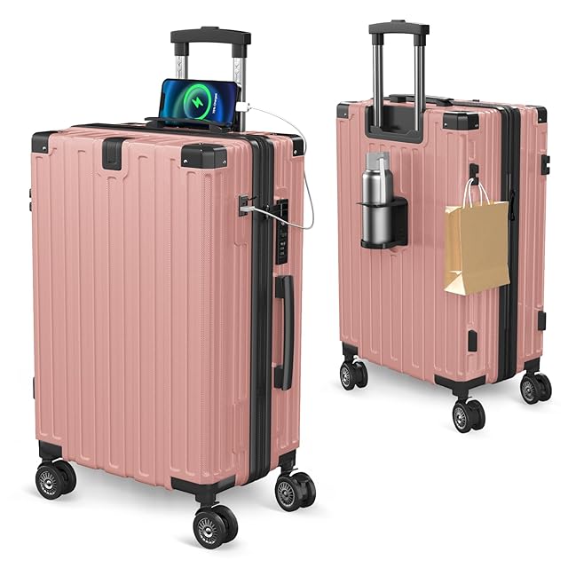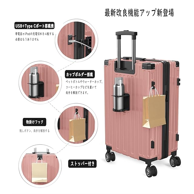 [Vivcon] スーツケース 拡張機能付き 多機能 キャリーケース ストッパー付き USBポート付き カップホルダー付き 超軽量 キャリーバッグ 隠しフック付き 耐衝撃 大型 静音 ダブルキャスター TSAローク搭載 ファスナータイプ 旅行 ビジネス 出張 (ピンク, Mサイズ (4~7泊))