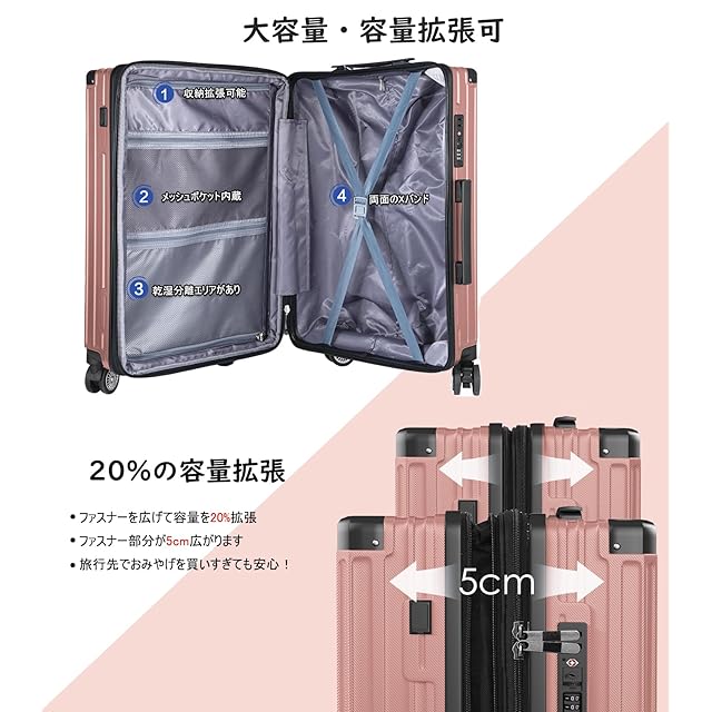 【拡張可能・大容量タイプ】ファスナータイプで、マチ幅を5cm拡張するだけで容量が20%UPできる。旅先でお土産が増えても安心です。※拡張時は機内持ち込み不可。※親切なヒント: このスーツケースは拡張二層ジッパースーツケースであるため、内側のジッパー収納部は2つのジッパーの接合部を避ける必要があるため、やや下向きに縫製されており、ジッパーが開く収納部のスペースは比較的小さくなっています。 しかし、スーツケース本体全体の内部の収納スペースは非常に大きいです