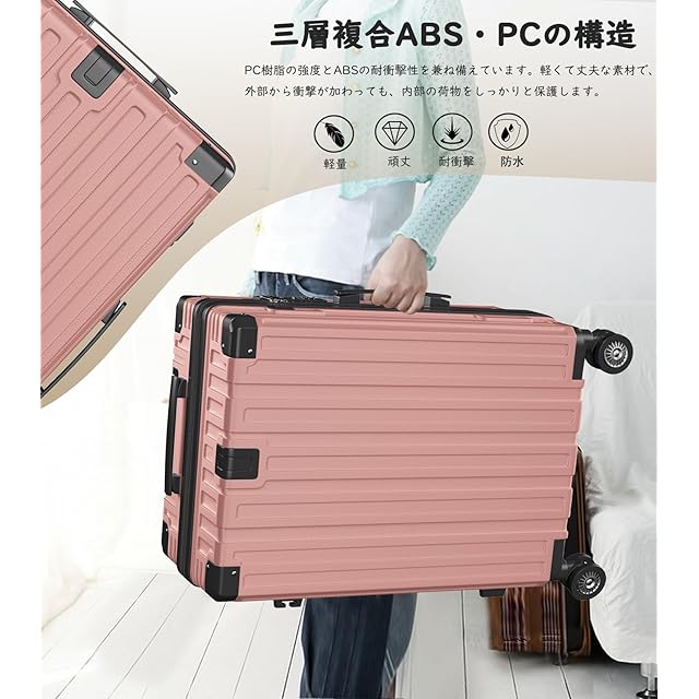【高品質なボディ&丈夫かつ軽い素材】軽さと堅固性に優れているPC (ポリカーボネート)とABS樹脂を配合したボディ。女性でも持ち上げられる軽さですが、衝撃に強く中の荷物をしっかりと守ります。 衝撃にも強く、無数に細かい凸凹が傷をつきにくくしてくれます。ケースのメンテナンスに関するヒント: 傷やへこみを避けるため、鋭利なものでスーツケースを傷つけたり、激しい摩擦や衝突を与えたりしないように注意してください。