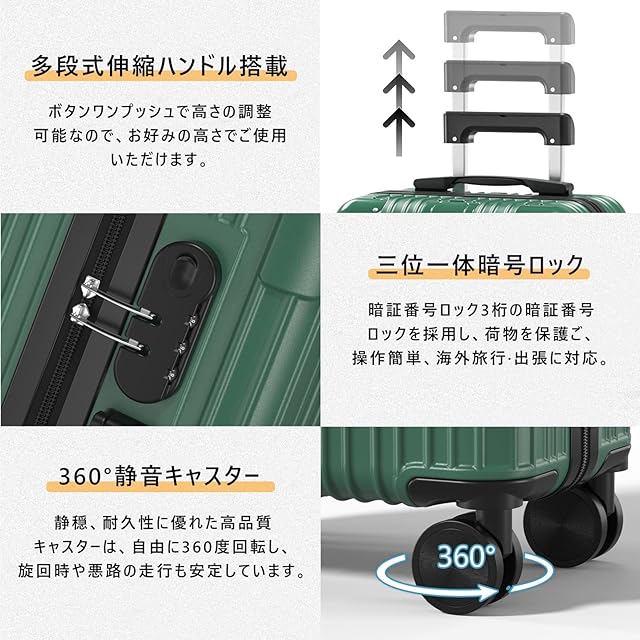 [SupTrip] スーツケース 機内持ち込み キャリーケース USBポート付き キャリーバッグ カップホルダー付き 隠しフック機能 多機能 大型 超軽量 静音 ダブルキャスター 耐衝撃 360度回転 軽量 ビジネス 修学 泊まる 旅行 出張 (グリーン, Lサイズ (7泊~長期旅行))