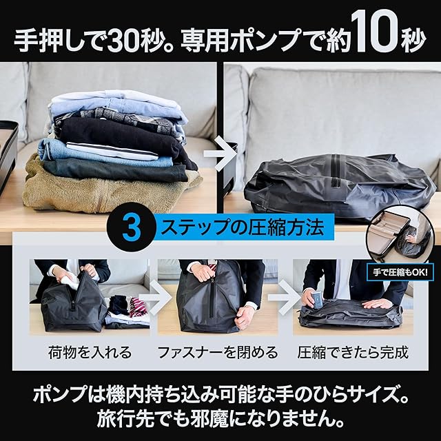 ✅【電動ポンプなら約10秒で圧縮】圧縮トラベルバッグは付属の電動ポンプを使うと約10秒で高速圧縮できます。パワフルなのにコンパクトなので持ち運びにも便利です。3秒間長押しでロックをかけられるのでカバンの中での誤作動を防げます。