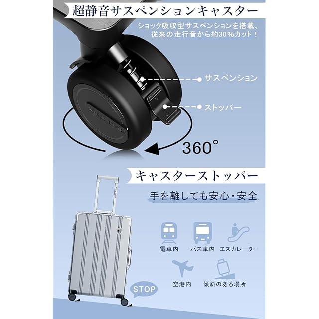 【超静音キャスター&ストッパー付き】360度回転可能のダブルキャスターにショック吸収サスペンションを搭載し、段差のあるところを走行する際の衝撃を吸収しより高い静音性を発揮します。従来の走行音から約30%カット!早朝と深夜でもストレスなくスムーズな走行が可能に。また、キャスターにストッパーが付いているため、電車内などスーツケースが自走してしまう環境でもストッパーをかけておくだけでスーツケースが動き回るのを防ぎます。