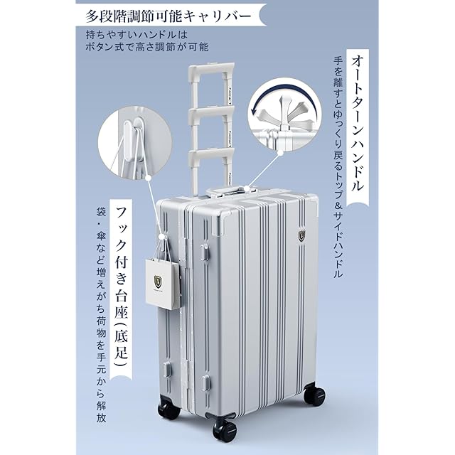 【多段調節キャリバー&物掛けフック&オートターンハンドル】アルミ合金製の超軽量のキャリバーは伸縮可能で、ご自分の身長に合わせて、最適な高さに調節できます。キャリーケースのボディ側面の台座に手提げ袋など掛けられるフックを搭載しています。外出中増えがちな荷物を、手持ちから解放してくれる便利機能です。トップとサイドのハンドルは、手を離すと自然と元の位置に戻るオートリターン機能が付いています。
