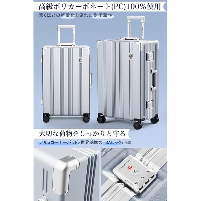 【耐久性抜群&セキュリティに強い】PC(ポリカーボネート)100%ボディとアルミフレームを備えたスーツケースです。ボディ素材にはPC素材を100%使用し、驚くほどの軽さと高い耐衝撃性を実現しました。開閉部分には強化アルミフレームを採用しており、骨組みとしての役割を果たすことで、強度や耐久性、防水性を確保しています。密閉性が高く、セキュリティ面でも安心です。