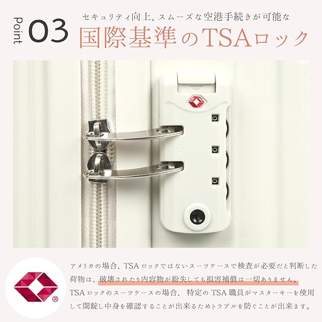【簡単施錠が可能なTSAダイヤルロック】鍵が不要なTSAダイヤルロック式を採用しており、3桁の番号を設定するだけ簡単施錠です。※スーツケースには差し込み用の鍵は付属しません。付属の鍵穴は税関検査時の解錠に使用するものとなります。
