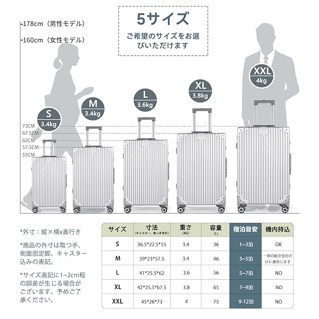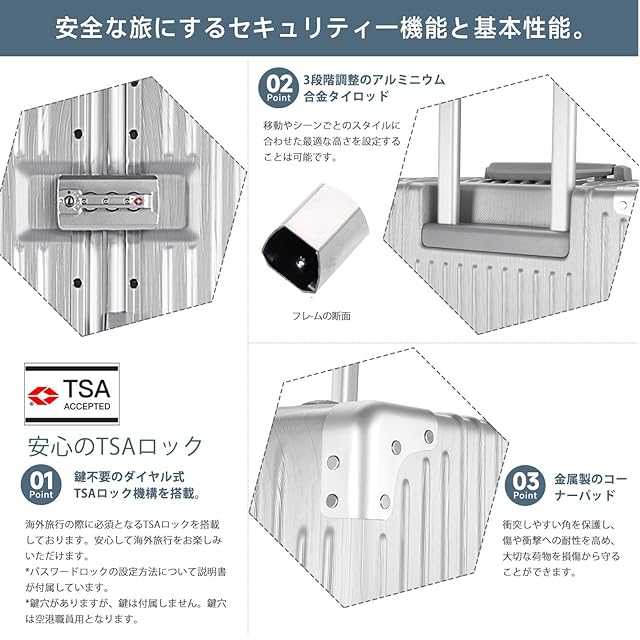 ◆【6月新登場・超軽量・大容量】1,表面素材には三層構造のPCポリカーボネート樹脂+ABS素材を採用しており、軽量なのに耐衝撃性に優れています。長期間使用しても傷が目立ちにくいです。人気のアルミフレームを採用しており、ビジネスでもカジュアルでもシーンを選ばずに使用できます。スタイリッシュでありながら、と国内旅行や出張には十分な大きさです。 2,フレーム:アルミ。軽量で持ち運びやすいです。女性でも男性でも持てるカラーとデザイン。