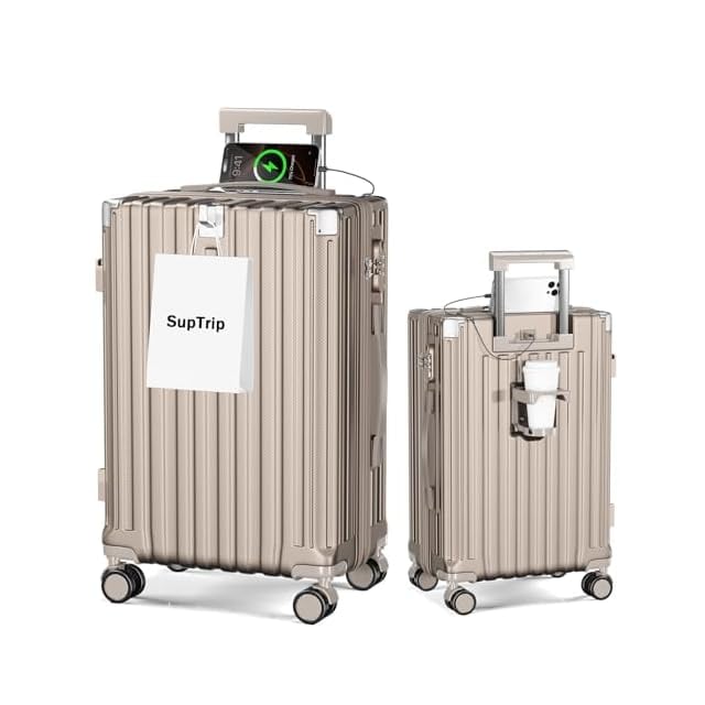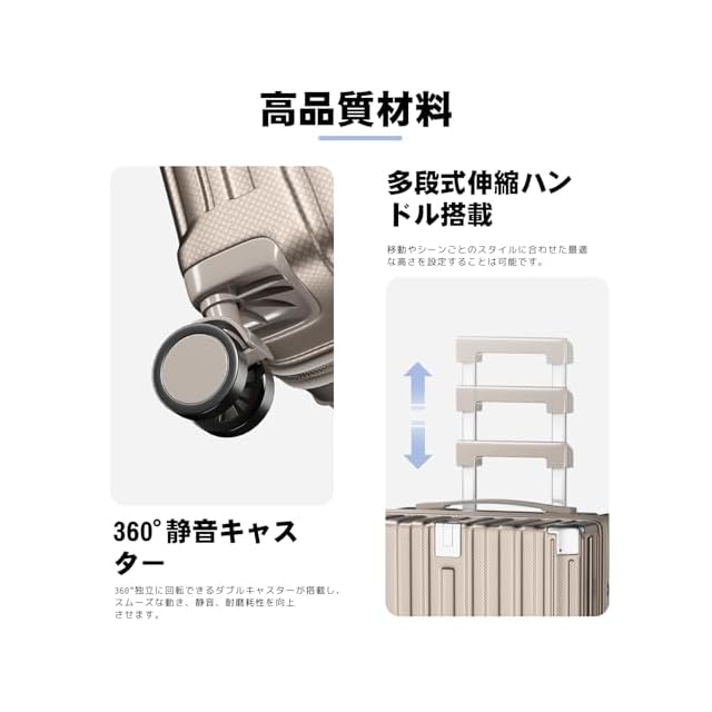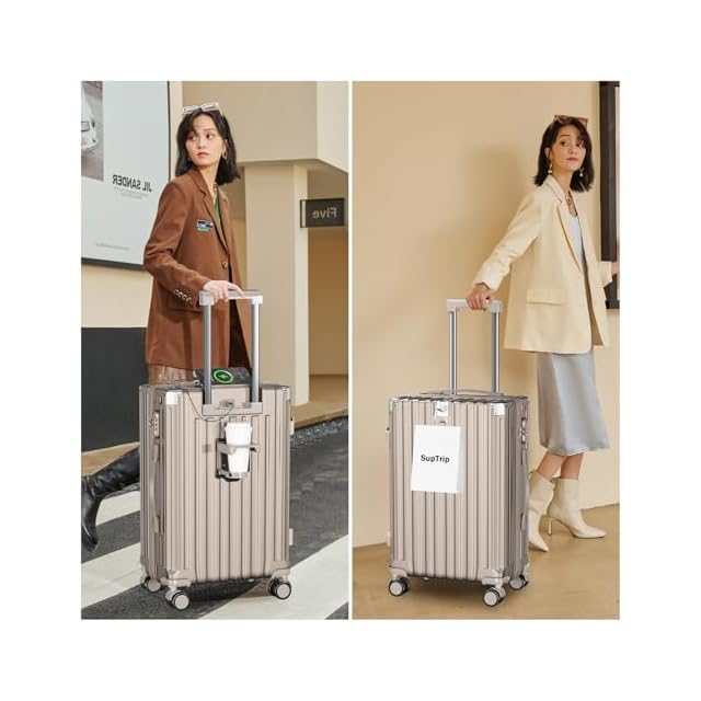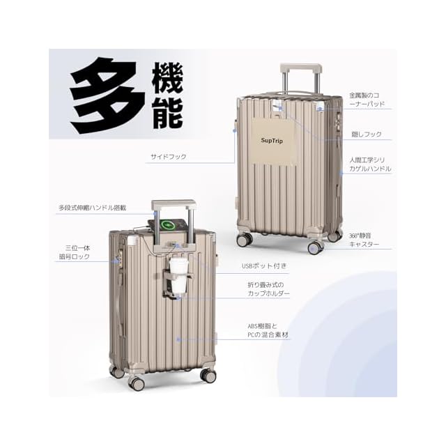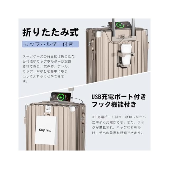[SupTrip] スーツケース 機内持ち込み 多機能 キャリーケース 大型 超軽量 キャリーバッグ 耐衝撃 USBポート付き カップホルダー付き 充電機能 荷物フック 隠しフック機能 静音 ダブルキャスター 360度回転 修学 泊まる 旅行 出張 (シャンパンゴールド, XL (78L/7-10泊))