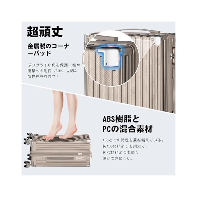 【軽量で頑丈なABS+PCボディ】 本体は軽量性と耐衝撃性に優れたABS樹脂とPCの複合素材を採用。女性でも楽に持ち上げられる重さです。表面に施された無数の微細な凹凸模様が傷つきを防止し、さらに四隅にアルミニウム合金製メタルガードを4ヶ所配置。耐衝撃性能を向上させることで、スーツケースの耐久性をさらに高めています。