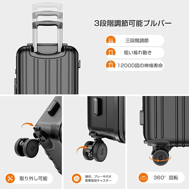 【拡張機能付きと3段階調節可能プルバー】ファスナータイプで、マチ幅を5cm拡張するだけで容量が20%UPできる。旅先でお土産が増えても安心です。軽量かつ頑丈なアルミ合金製のキャリバーは、ボタンワンプッシュで身長や利用シーンに合わせて多段階調整ができます。