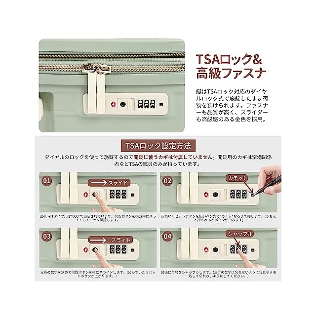 【TSAロック・360度回転静音キャスター】海外旅行には欠かせないTSAダイヤル方式のロックが搭載されており、外出がより安全になります。※鍵は航空会社検査専用のため本製品には付属しておりません。静穏、耐久性に優れた双輪キャスター、スムーズな滑りを実現しながら、360度の自由回転もできます。