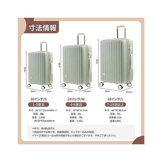 【機内持ち込みサイズ】:57×36×25cm(拡張時+5)三辺合計118cm。サイズは外寸(高さはキャスターを含む地面からの高さです。)機内持ち込み可能 キャリーケース。容量:40L(拡張後48L)、宿泊目安:1~3泊。