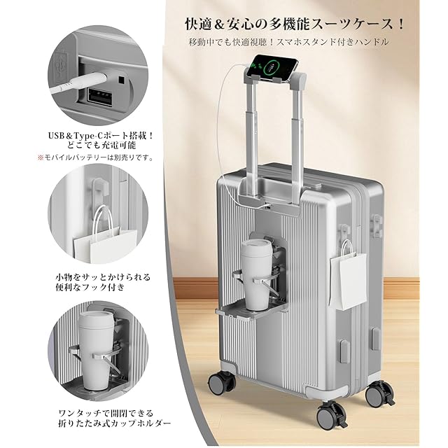 【キャスター ストッパー付き 、USB+Type C充電ポート付き 、 カップホルダーとスマホルダーを付く】 スーツケースには4つのブレーキ付きホイールが付いています。。走行中の揺れる電車内でもストッパー(ブレーキ)機能でピタっと自立。乗降時や座席の離着席時などではすぐにストッパー解除ができるのでスムーズに移動を再開することができます。スーツケースにモバイルバッテリーを収納するポケットがついており、 USB+Type Cポートの充電口が外にあることで、いつでもどこでも充電できます。便利な折りたたみ式ドリンクホルダー付き。バックカップホルダー、ミルクティーカップ、傘いつでも配置でき、旅行をより便利にすることができます。レバーの上部にはスマホルダーが付いているので、フライトの待ち時間に両手が自由になり、外出先でもリラックスできます。