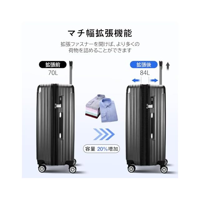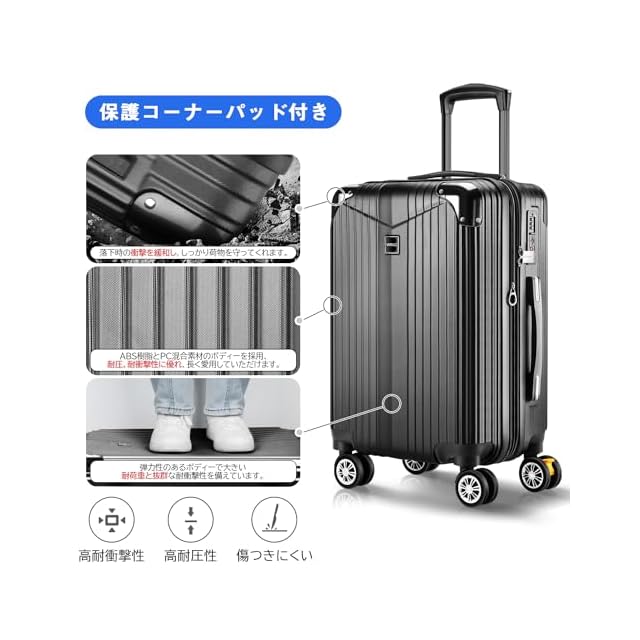 【20%容量拡張&高品質コーナーパッド】スーツケースの拡張機能を利用すれば、マチ幅が5cmほど拡張し、約20%内容量を増加。ABS樹脂とPC混合素材のボディーはただのABS素材より軽量で耐圧性、耐久性に優れています。コーナーパッド付きで、耐衝撃性も抜群です。