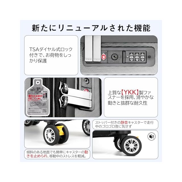 【YKK製ファスナー&TSAダイヤル式ロック】スーツケースのファスナーは【YKK】製ファスナーを採用し、滑やかな動きと抜群の耐久性を発揮。(製品に【YKK】制のタグが付いています。)TSAダイヤル式ロック付きでより安全、安心してご利用いただけます。※鍵穴が航空会社の検査専用の物で本製品は鍵が付属しておりません。