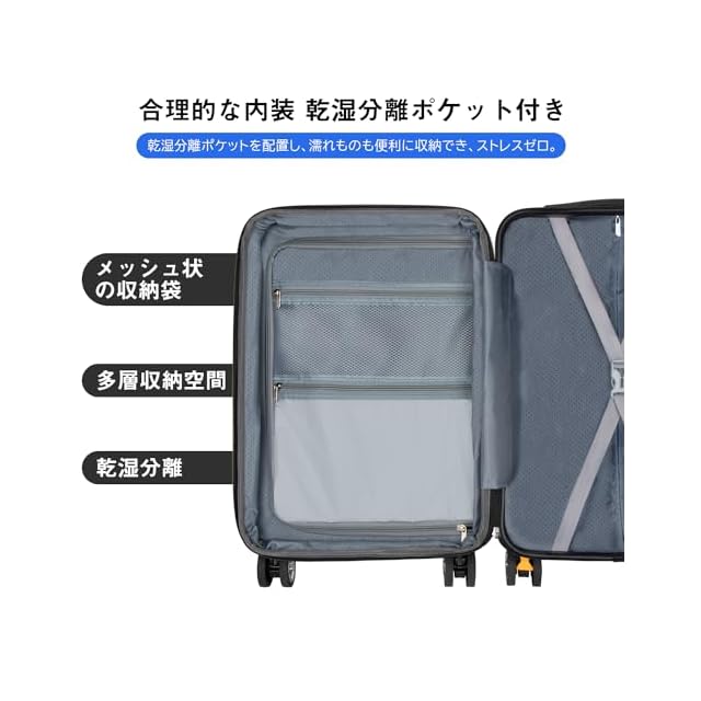 【合理的な内装&乾湿分離ポケット】合理的な内装デザインで乾湿分離ポケットも追加され、濡れものの収納に大変便利。メッシュポケット付きで小物などのお荷物が分かりやすく、一目瞭然。U型仕切り、クロスベルトまで完備され、荷物崩れを完全防止。