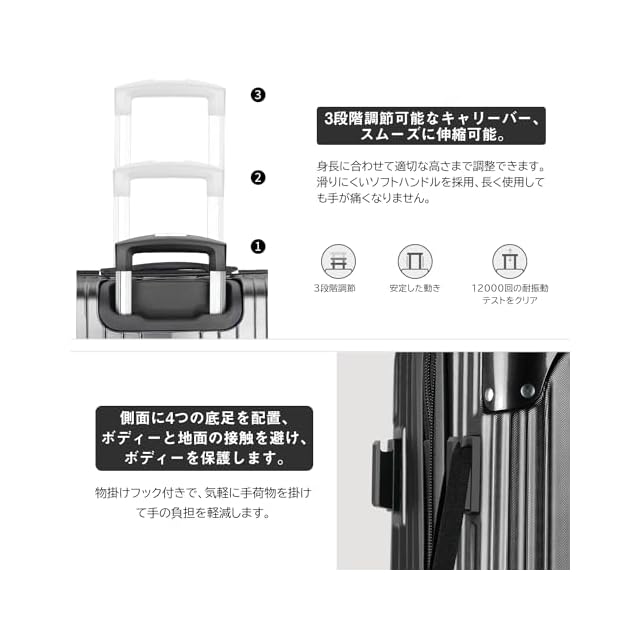 【静音キャスター&調節可能なキャリーバー】キャリーケースは三段階調節なアルミ合金制キャリーバーを採用し、スムーズに伸縮可能。TPE素材で作られた静音キャスターが走行中の振動を軽減し、高耐摩耗性、静音性を実現しながら、360°自由に回転可能。後ろの2個のキャスターにストッパー付き、傾斜のある地面でも簡単にキャスターの動きを止められ、移動中のストレスを軽減。