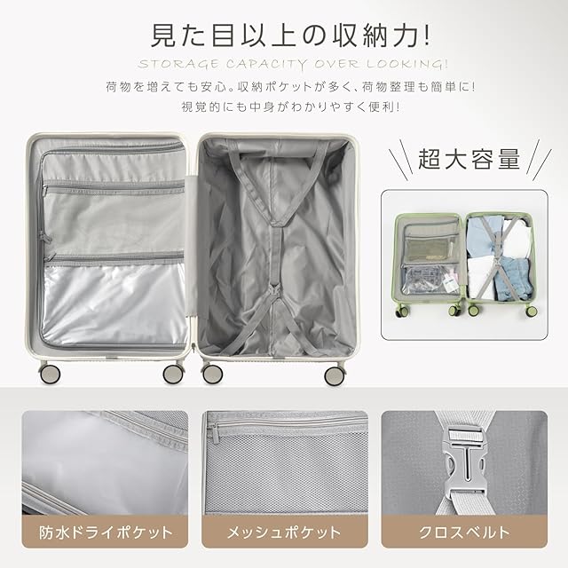 【大容量&多機能】内装に再生素材を使用しました。高品質裏地素材と両面のXバンド合わせて、荷物をスッキリ収納できます。便利な仕分けポケットで荷物を衛生的に整理できて、乾湿を分けて収納できます。インテリアは合理的な収納仕切りで、行きも帰りも楽になります。スーツケース 機内持ち込みでき、USB充電ポート付き、ドリンクホルダー&荷物フック付き、多機能なデザインと使いやすさが魅力です。