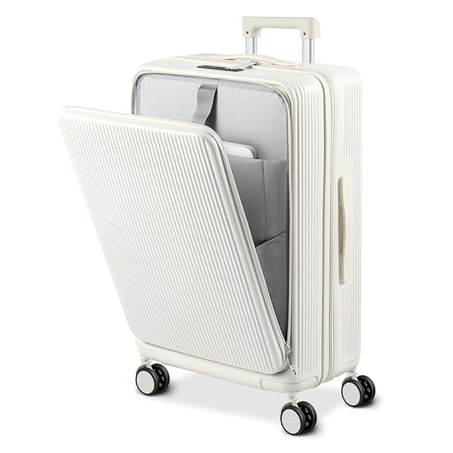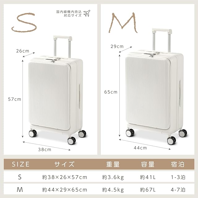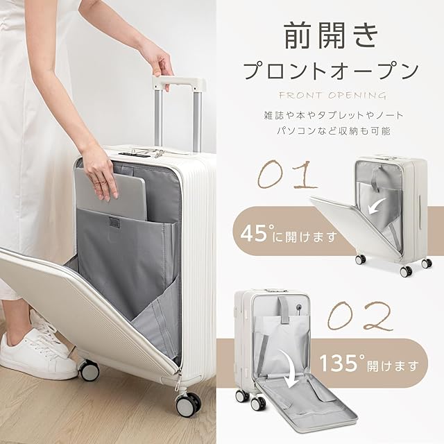 【最新登場&フロントオープン】新型スーツケースはフロントオープン型で、立てたまま荷物の出し入れができるので便利です。空港や電車内、移動中で荷物を出し入れしやすいです。PC用ポケット「サイズ:31*32cm」で15インチまでのパソコン、タブレット、書類などが収納できます。容量:約41L 重量:4.3 kg 機内持ち込みOKSサイズ:57*26*38