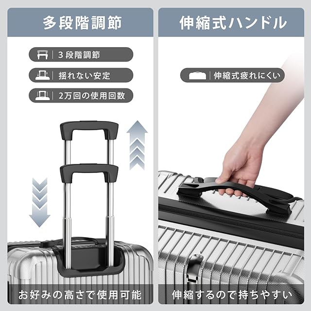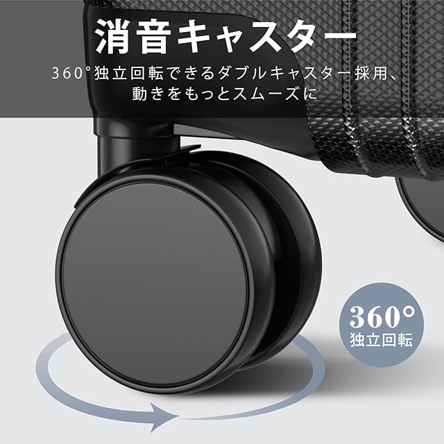 【多段階キャリバー&消音キャスター】スーツケースは超軽量アルミ製キャリバーを採用、頑丈で揺れ動きにくく、キャリバーの高さを2段階で自由調節できます。高弾性TPE衝撃軽減素材&360°独立回転できるダブルキャスターを採用し、スムーズな動きと安定した走行が可能となります。