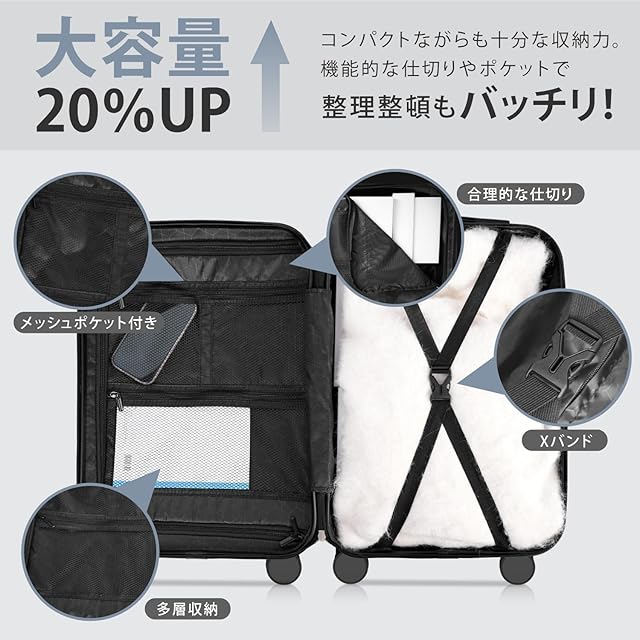 【✅隠しフック・大容量収納抜群】隠しフックもあり、鞄などかけて手への負担も軽減できる キャリーケース です。また、メッシュポケットにより、収納しにくい小物でもは一目でわかります。X型ベルトが完備され、荷物崩れを完全防止。収納力抜群、初心者の方から旅慣れた方まで幅広くご利用頂けるスーツケースです。