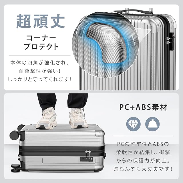 【ABSとPC&耐衝撃】機内持ち込みOK (Sサイズ):約W37×D22×H57cm、三辺の和は116cm、容量は約35L、重量は約2.4kgです。キャリーケースの表面はPC(ポリカーボネート)を使用、そして、傷が目立ちにくいマットエンボス加工、高耐衝撃性を持ち、高弾性で、変形しにくいです。中央は高品質ABS樹脂を使用、防水性、耐摩耗性を備えています。