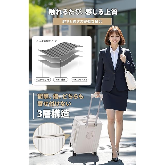 スーツケース 機内持ち込み・多段調節キャリバー・柔軟ハンドル】フロントオープン スーツケースはABS樹脂とPC混合素材を採用されており、軽量で耐圧性、耐久性に優れ、大切なお荷物をしっかりと守ってくれます。三段階調節なスムーズに伸縮でき、さまざまな体格の方に合わせて調整可能です。長旅や出張にも最適です。