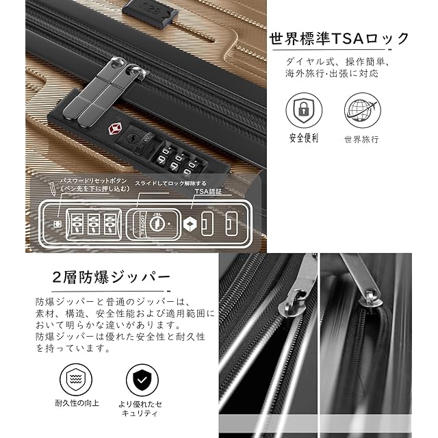 【三段調節キャリバー・世界基準の安全性】超軽量のアルミニウム製キャリバー、高さ三段階調節、ご自分の身長に合わせてスムーズに調整が可能です。耐振性に優れるデザインで荷物を引きかける時、しっかりしています。また、滑りにくいソフトハンドルで長い時間の手提げでも手は疲れません。海外旅行には欠かせないTSAダイヤル方式のロックが搭載されており、外出がより安全になります。※鍵は航空会社検査専用のため本製品には付属しておりません。