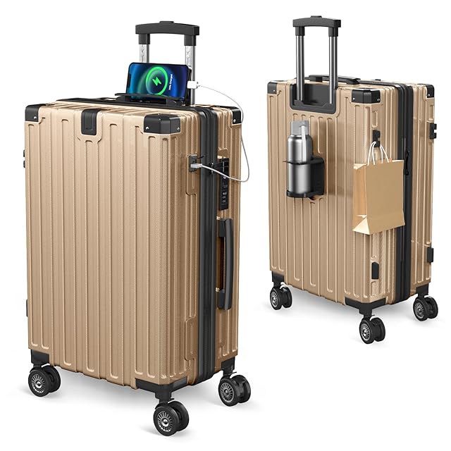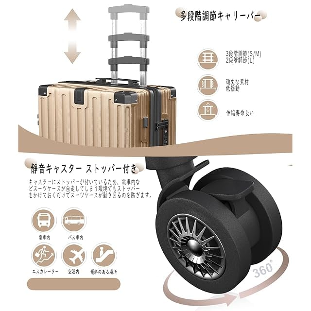 [Vivcon] スーツケース 拡張機能付き 多機能 キャリーケース ストッパー付き USBポート付き カップホルダー付き 超軽量 キャリーバッグ 隠しフック付き 耐衝撃 大型 静音 ダブルキャスター TSAローク搭載 ファスナータイプ 旅行 ビジネス 出張 (シャンパンゴールド, Sサイズ/機内持込(1-3泊))