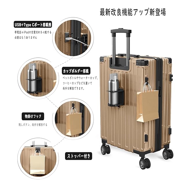 【ストッパー付き 、USB+Type C充電ポート付き 、 カップホルダー】走行中の揺れる電車内でもストッパー(ブレーキ)機能でピタっと自立。乗降時や座席の離着席時などではすぐにストッパー解除ができるのでスムーズに移動を再開することができます。スーツケースにモバイルバッテリーを収納するポケットがついており、 USB+Type Cポートの充電口が外にあることで、いつでもどこでも充電できます。便利な折りたたみ式ドリンクホルダー付き。バックカップホルダー、ミルクティーカップ、傘いつでも配置でき、旅行をより便利にすることができます。