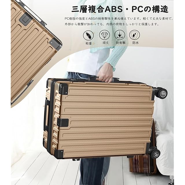 【高品質なボディ&丈夫かつ軽い素材】軽さと堅固性に優れているPC (ポリカーボネート)とABS樹脂を配合したボディ。女性でも持ち上げられる軽さですが、衝撃に強く中の荷物をしっかりと守ります。 衝撃にも強く、無数に細かい凸凹が傷をつきにくくしてくれます。ケースのメンテナンスに関するヒント: 傷やへこみを避けるため、鋭利なものでスーツケースを傷つけたり、激しい摩擦や衝突を与えたりしないように注意してください。
