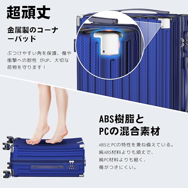 【軽量で頑丈なABS+PCボディ】 本体は軽量性と耐衝撃性に優れたABS樹脂とPCの複合素材を採用。女性でも楽に持ち上げられる重さです。表面に施された無数の微細な凹凸模様が傷つきを防止し、さらに四隅にアルミニウム合金製メタルガードを4ヶ所配置。耐衝撃性能を向上させることで、スーツケースの耐久性をさらに高めています。