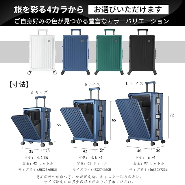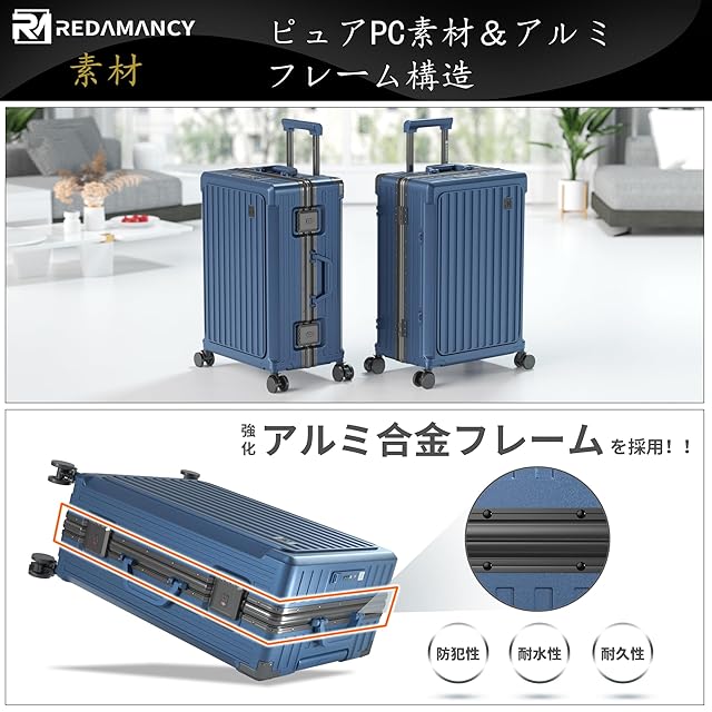 【軽量で耐久性のPC素材 & 包角保護 & アルミフレーム】高品質ポリカーボネート(PC)素材:軽量でありながら非常に丈夫な構造を実現。衝撃に強く、長期的な使用でも変形しにくいので、安心してお使いいただけます。包角保護:には強化された包角保護が施されているため、落下時の衝撃からスーツケースを守り、外観も美しく保てます。アルミニウムフレーム:アルミニウム製のフレームを採用し、全体的な強度を向上させ、耐久性を高めています。この特徴の組み合わせにより、このスーツケースは市場平均より30%耐久性が高くなっている!Redamancyは、お客様の満足度を最優先に考え、最高品質の製品をお届けします。万が一問題があった場合は、迅速に対応いたします。