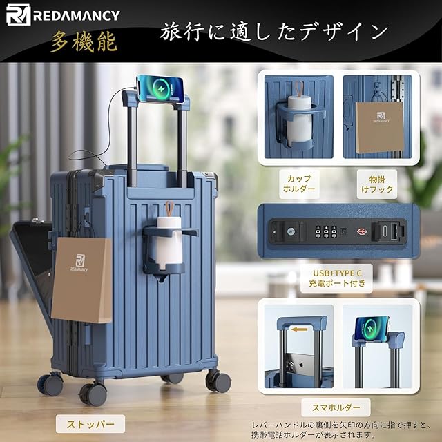【2025 最新多機能スーツケース】Redamancyスーツケースのアップグレード,USB+Type-Cダブル充電ポート,水筒ホルダー,荷物フック。旅行中にスマートフォンやタブレットを簡単に充電できるUSBとType-Cのダブル充電ポートを装備。複数のデバイスを同時に充電可能です。フック付きなので、バッグやコートなどを簡単に吊るすことができます。手ぶらで行動でき、荷物管理が楽になります。