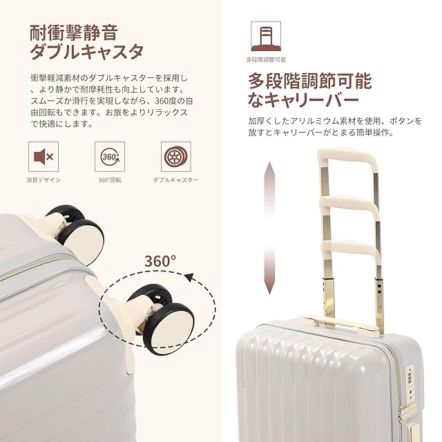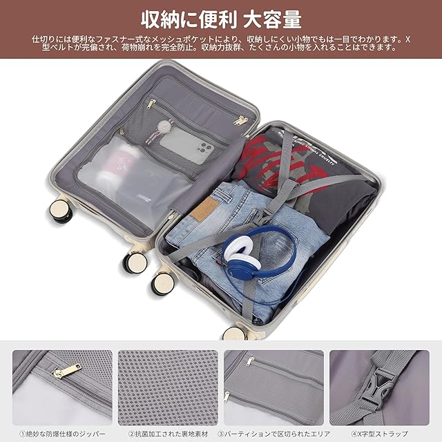 【大容量・拡張機能付き】マチ幅を5cm拡張するだけで容量が20%UPでき、他業者のスーツケースより多く収納できます。そのため荷物が増えても十分にご使用いただけます。ご注意:拡張機能後は機内持ち込み不可。