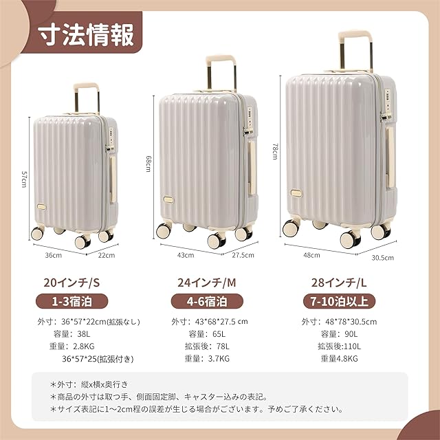 【Mサイズ】:78×43×27.5(拡張時+5)cm、容量:65リットル (拡張時78L)、宿泊目安:4~6泊。シンプルで大きいスーツケースが欲しい人向け。
