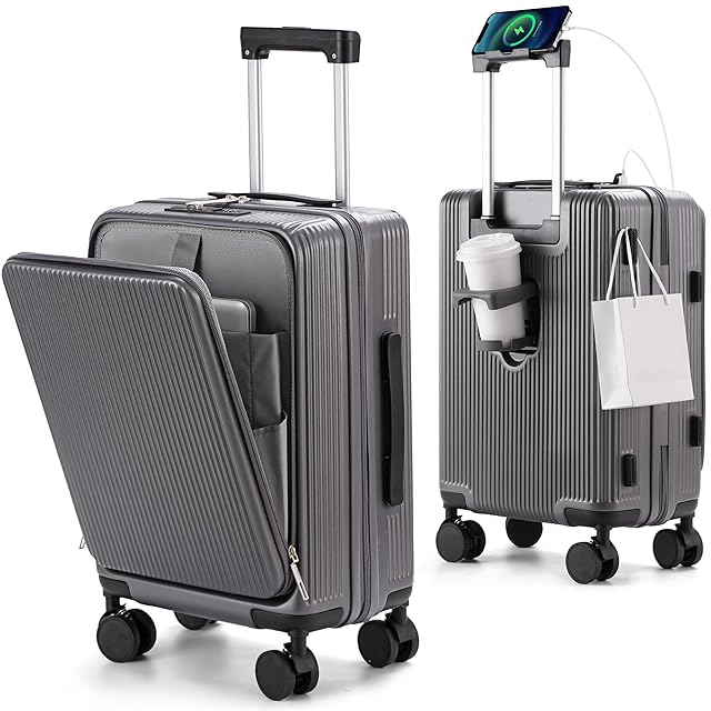 [MULARDA] 前開きキャリーケース スーツケース機内持ち込み 耐衝撃 超軽量 USBポート付き Sサイズ 大容量 1-3泊 旅行 ビジネス 出張 グレー