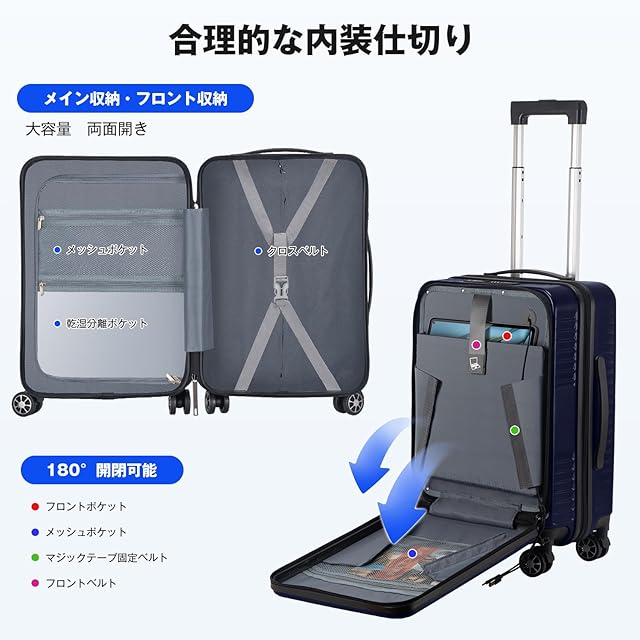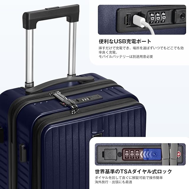 【便利なフロントオープン設計】スーツケースは便利なフロントオープンポケットを搭載し、パソコンやタブレット、パスポートなどの荷物を立てたまま簡単に取り出すことができます。便利なUSB充電ポート付きで、場所を選ばずいつでもどこでも移動しながら効率よく充電ができ、より快適な旅行を楽しめます。