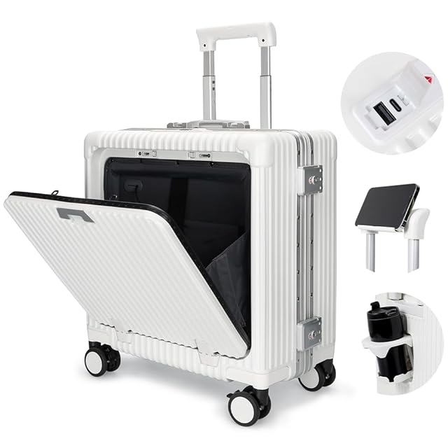 [魔法小屋] スーツケース 前開き キャスターストッパー付く キャリーケース 機内持ち込み キャリーバッグ フロントポケット スーツバッグ USB Type-C 充電口 多機能 軽音 軽量 側面フック カップボルダー 旅行出張1-3泊(XSサイズ 41L 機内持ち込み ホワイト)