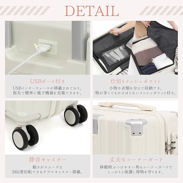 【多様な機能で快適な旅をサポート】ドリンクホルダー、フック機能、USBポート、スマホスタンドなど快適な旅をサポートするために必要な機能を備えています。また、ダブルキャスターを採用しており、360度自由自在に動き、静音性に優れゴロゴロ音を気にする必要はありません。