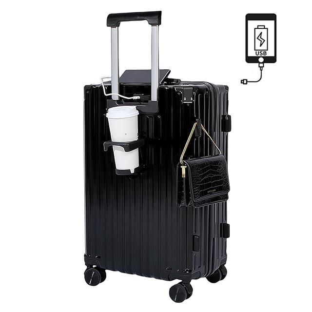 [SUPBOX] スーツケース 機内持ち込み キャリーケース USBポート付き キャリーバッグ カップホルダー付き 隠しフック機能 充電機能 大型 静音 ダブルキャスター 耐衝撃 360度回転 軽量 修学 泊まる 旅行 出張 (Mサイズ/47L, ブラック)