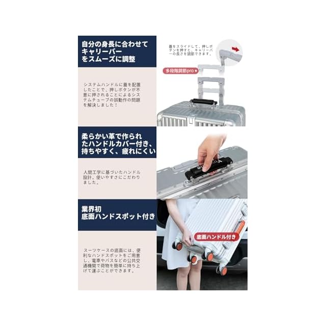 【便利なトップハンドルと下部ハンドル】スーツケースの上部と下部には、便利なハンドルが搭載されており、電車やバスなどの公共交通機関で荷物を簡単に持ち上げて運ぶことができます。特に、荷物棚に収納する際、これらのハンドルが便利で、スムーズに持ち上げて設置することができます。さらに、上部のハンドルとメインハンドルにはレザー製のカバーが施され、ブランドロゴが刻印されており、ファッション性と快適な握り心地を提供します。