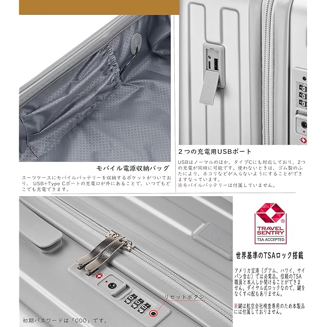 【USB+Type-C充電ポート】スーツケース内部にはモバイルバッテリー用の専用ポケットがあり、外部にはUSBとType-C充電ポートが装備されています。どこでも手軽にデバイスの充電が可能です。充電方法: スーツケース内のUSBケーブルをモバイルバッテリーの出力端子(OUTPUT)に接続してください。(入力端子(INPUT)には接続しないでください)。その後、ご自身のケーブルを使用してスマートフォンや他の電子機器をスーツケース側面の充電ポートに接続することで、デバイスの充電が可能です。*(モバイル電源は製品リストに含まれていないため、自分で用意する必要があることに注意してください。)