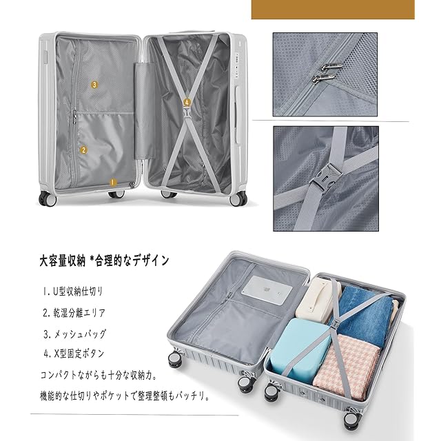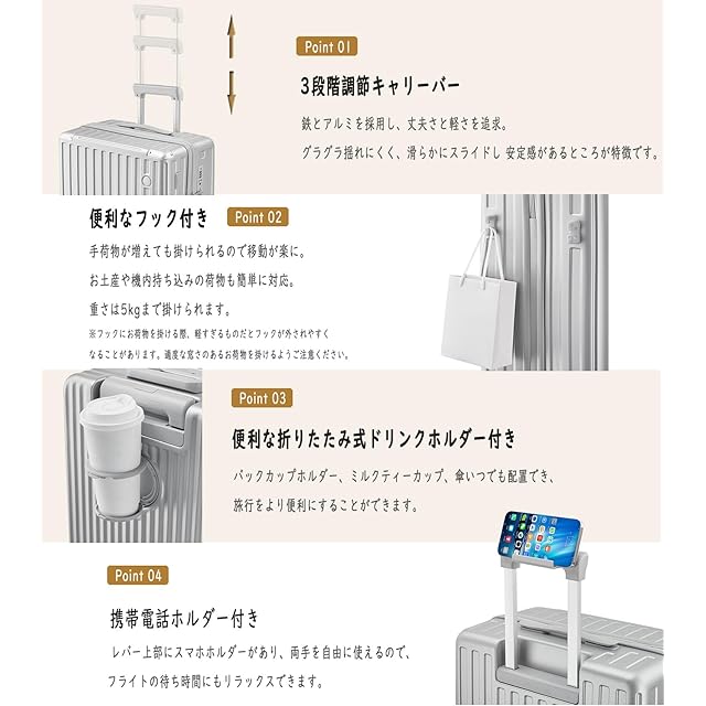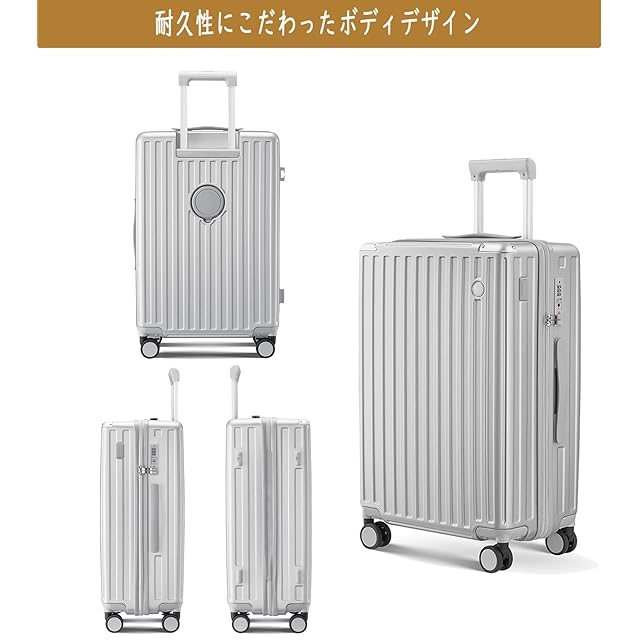 [Aecall] スーツケース 機内持ち込み キャリーケース ストッパー付き 超軽量 USBポート付き カップホルダー付き 携帯スタンド 隠しフック機能 キャリーバッグ 耐衝撃 静音 ダブルキャスター TSAローク ファスナータイプ キャリーバッグ 人気 おしゃれ 旅行 ビジネス 出張 留学 (シルバー, Mサイズ/4~7泊/託送必要)