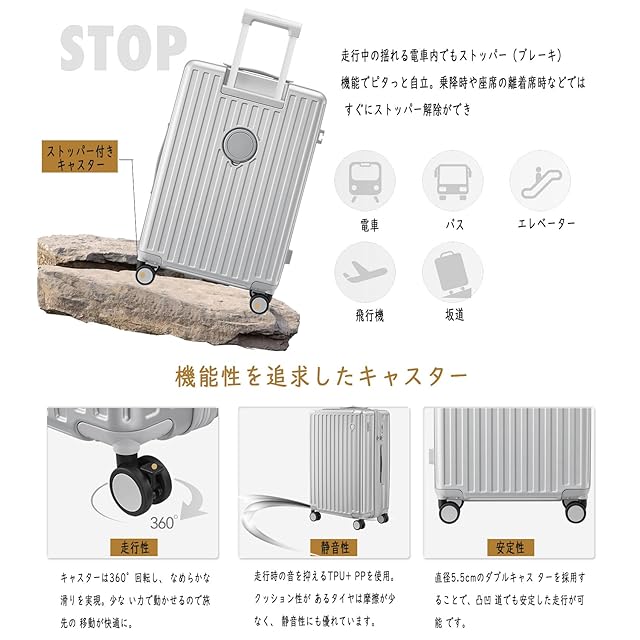【キャスターストッパー機能】移動中の揺れにも対応するストッパー機能で、電車やバスの中でもしっかりと自立し、安全で便利な使用が可能です。また、ストッパーはワンタッチで解除できるため、乗降や移動の再開もスムーズです。サイドフック付き、モノ掛けで旅行が楽々、とっても便利で手荷物が増えたに対応します。