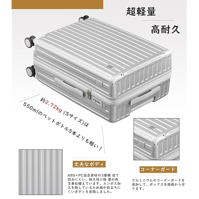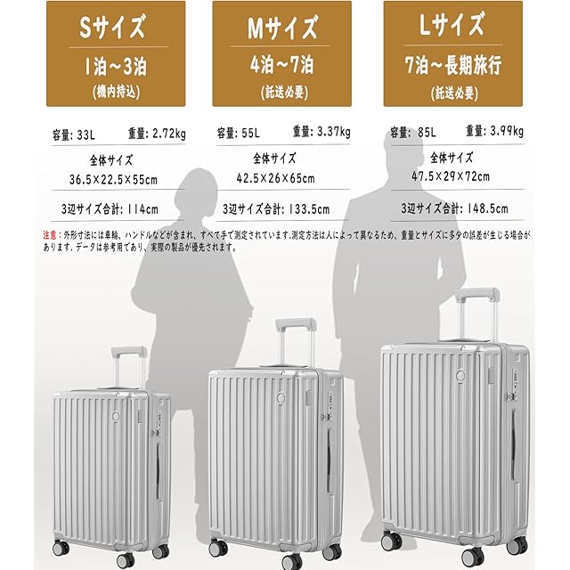 【サイズ】Sサイズの外寸は55*36.5*22.5cm、重さ:2.72kg 超軽容量、は33リットル、1~3泊に似合います。Sサイズは3辺全長114cmで機内持ち込み可能です。Mサイズの外寸は65*42.5*26cm、3辺の合計は133.5cmです、重さ:3.37kg 、容量は55リットル、4~7泊以上。Lサイズの外寸は72*47.5*29cm、3辺の合計は148.5cmです、重さ:3.99kg、 容量は85リットル、7泊以上。